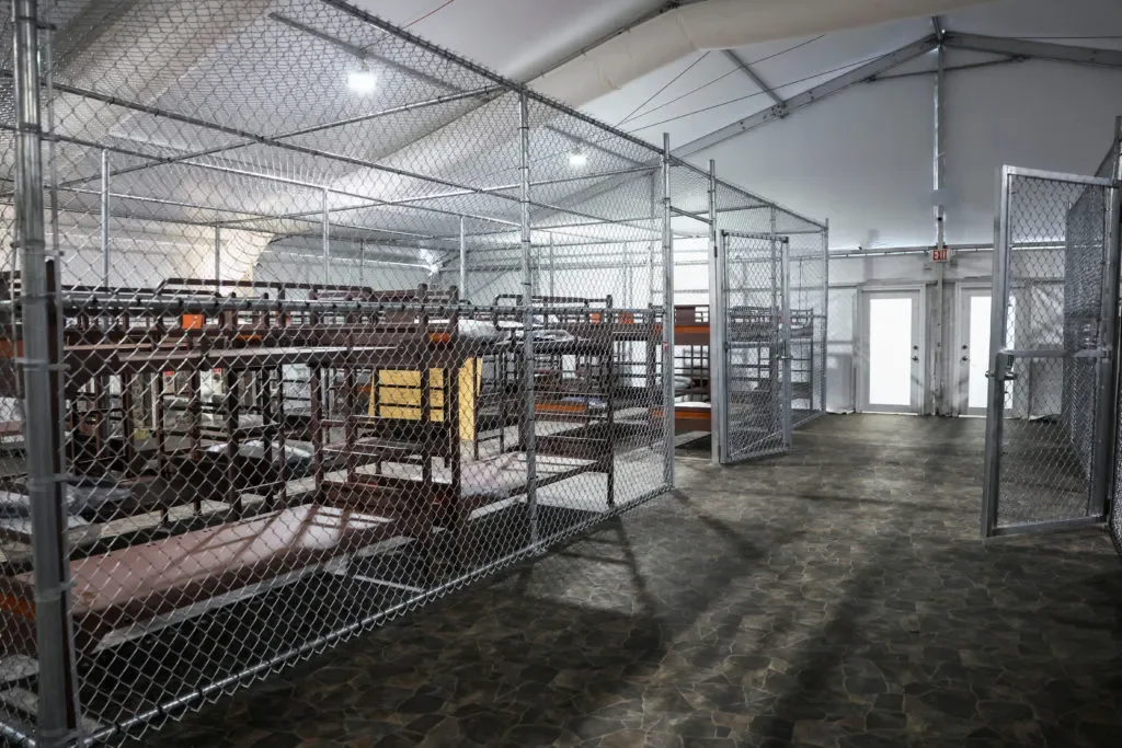 The migrants inside are living this definition—word for word. Underneath a tent, caged in and bunked on top of each other.