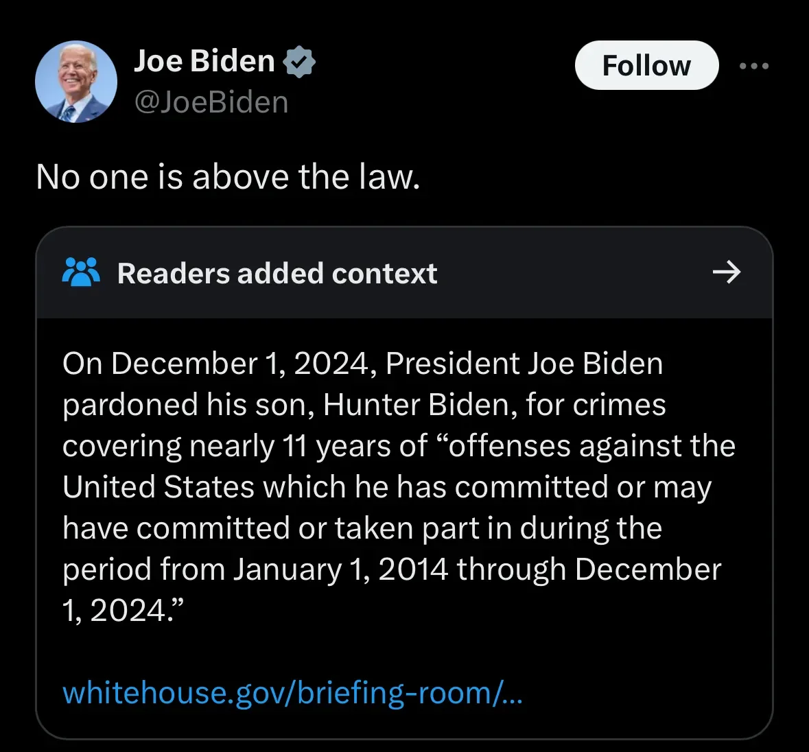 I understand the love for your son. I truly do. But pardoning a whole criminal when you said you wouldn’t is weird. To be fair, no one believed you anyway.